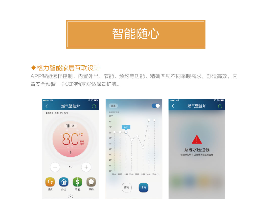 分段燃燒,20%~100%寬域功率輸出,防止夏季水溫過高過燙,智能水溫調節(jié),±0.5℃精準控溫,溫度設定廣,生活熱水35℃~60℃,暖氣片供暖用水30℃~80℃,地暖供暖用水30℃~60℃