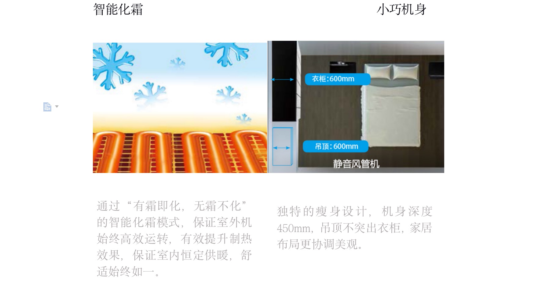 采用“V”型換熱器,開機初期,根據(jù)室內(nèi)溫度與設定溫度自動調(diào)節(jié)至高頻狀態(tài),縮短制冷或制熱時間,提升舒適度